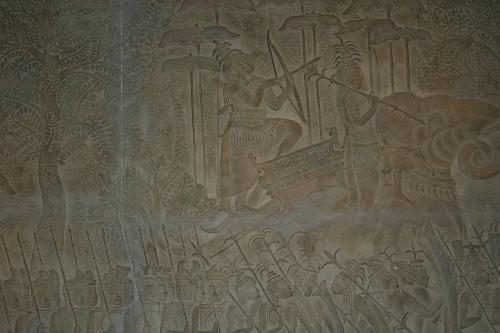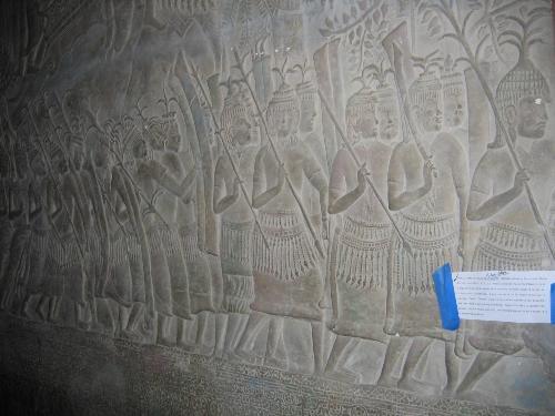 ROYAL THAI FUNERAL PROCESSION - Nearly filling the wall of the Palace foyer is a copy of but one of the panels which decorate the inner temple of the shrine of Angkor-Vat in Cambodia. It was reproduced for the Palace of Living Arts at the Movieland Wax Museum by the Louvre Museum in Paris, France. The panel is part of the greatest expanse of bas-relief that has been found in any existing monument. Angkor-Vat is probably the largest religious edifice ever built, encompassing approximately a square mile of sculptured sandstone.
