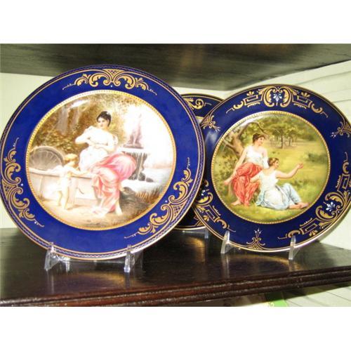 FABULOUS SET OF 8 ROYAL VIENNA COBALT BLUE CABINET PLATES ALL HAND DECORATED AND GILDED, EACH PLATE HAVING A DIFFERENT SUBJECT. ALL SUBJECTS ARE MAIDENS SCANTILY DRESSED, SOME WITH BABIES SOME ARE NUDE. THESE PLATES ARE ALL IN VERY GOOD CONDITION AND WERE MADE CA 1895. THE BACK OF EACH PLATE HAS THE 'BEEHIVE' MARK FOR VIENNA.