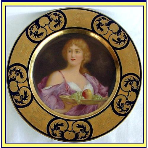 Artist signed handpainted portrait plate of a blond beauty holding a still life arrangement of fruit on a tray. Royal Vienna and Ernst Wahliss marks, Austria 1903.<BR>9 3/4inches in diameter.<BR>Cobalt ground of sloping sides almost entirely covered with rich gold layer with raised urns and jewels in gold. <BR>The 'bowl' of the plate depicts a magnificent young lady with long blond hair, wearing purple and white robes in the Grecian manner and holding a tray of fruit, almost as an offering, in <BR><BR>front of her. The painting is of the very highest calibre - great quality to skin tones, hues and texture of hair and innocent expression on her face.<BR>Signed on the side LINICEO ? and ES. Back of plate has red handwritten: Bld 344 "Erde" Dec. 29 and the violet coloured mark for Ernst Wahliss (mark EW-5) with a depose <BR><BR>indication. Ernst Wahliss bought many of the Royal Vienna and RStK models during the late 19th century.<BR>Condition is excellent.