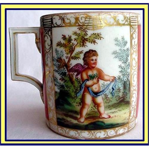 A Royal Vienna handpainted mug. Austria, 19th century.<BR>Measures 3 3/8 inches high.<BR>The mug is divided into 2 wide and two narrower panels, seperated by gold scrolling patterns and stencil work. The panel on which the handle is attached and the one opposite it have an orange backgrounds on which bright summer flowers are painted. The alternating panels are handpainted with cherubs in woodland scenes. Gilded handle. <BR>Underneath the mug has a blue underglaze beehive mark. <BR>Condition is good with acceptable wear to the gilding on the rims and handle, but no damage/chips/cracks or loss of paint.