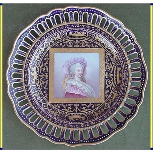 Scalloped, wavy border, with gold rim. Immitation enamelled white jewels on a cobalt blue ground follow the line of the border. WIthin, the sloping side is pierced with elongated arches, rimmed and highlighted in gold. The entire border and outside of the bowl is cobalt blue with rich gilded decoration, featuring panels with swans, foliage and scrolls. The bowl has a square reserve with a very rich, engraved gold border within which is a handpainted portrait of Marie Antoinette, the high, grey wig/hair unmistakeable under a lilac bonnet and yellow checkered scarf. Very finely painted features.