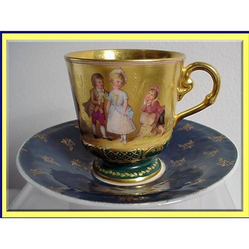 Stunning cup in very rich gold with forest green near the bottom. Swan handle with elegant and sinuous curve. Only the bottom shows the dark green ground, and this too is decorated with the richest, most beautiful gilding. Even the inside of the cup is gold. The circumference of the outside of the cup has a ring of youths / children in various romantic pursuits, all beautifully shown in pastel colours. Between and around them are raised gold flowers. The saucer with matching green ground has a delicate, lacy pattern in the center and a pattern of gold spriggs of flowers over the rest of the surface. <P>