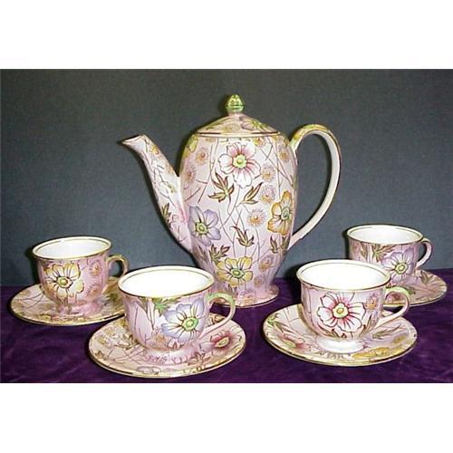 GORGEOUS ANTIQUE COFFEE SET, MADE BY ROYAL WINTON - GRIMWADES OF ENGLAND,DECORATED WITH BEAUTIFUL WHAT IT SEEMS VARIETY OF WILD FLOWERS WITH BASIC PASTEL PINK COLOR, EXQUISITE! THE SET IS MADE FOR 4 AND CONSISTS OF:4 DEMITASSE CUPS AND 4 SAUCERS AND TALL COFFEE POT WITH LID,ALL IN EXCELLENT USED CONDITION, NO CHIPS OR CRACKS BUT FOR SOME GLAZE CRAZING WHICH IS COMMON TO THIS TYPE OF CHINA.IF YOU HAVE ANY QUESTIONS PLEASE EMAIL US.THANKS FOR LOOKING!