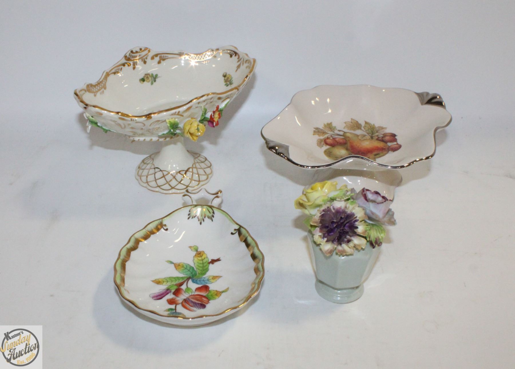 ELEVATED DISH + ANTIQUE DRESDEN PORCELAIN PEDESTAL/COMPOTE + 1839 HEREND HUNGARY + RADNOR BONE CHINA ENGLAND ARRANGMENT **ALL ITEMS MUST BE REMOVED BY 5PM SATURDAY, AUGUST 2ND 2025. ALL REMAINING ITEMS WILL BE SUBJECT TO A $6.00 PER DAY STORAGE CHARGE. ANY ITEMS REMAINING AFTER MONDAY, AUGUST 18TH 2025 WILL BE CONSIDERED FORFEITED. NO REFUNDS WILL BE ISSUED FOR FORFEITED ITEMS. TO SCHEDULE A PICK UP APPOINTMENT CLICK HERE
