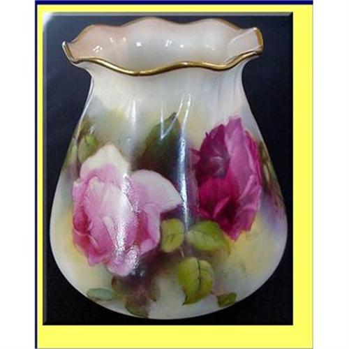 Royal Worcester vase, handpainted roses. Made 1914 England.<BR>Measures 3 3/8 inches high.<BR>Small round foot with gold trim, body is wider than the base, narrowing towards the top and with slightly flaring, wavy, ruffled gilt-edged rim. Pink and red roses painted in full bloom and in bud. <BR>Green Royal Worcester mark with numerals G957 and very light 1540. A total of 23 dots indicate the date 1914.<BR>Very good condition. No chips/cracks.