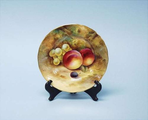ROYAL WORCESTER - MAPPIN & WEBB. A rare set of 7 dessert plates. Each with colourful hand painted fruit motives signed by the artist. Underside with underglaze Royal Worcester and distribution mark. Each 6 1/2" diameter. 3000-3500