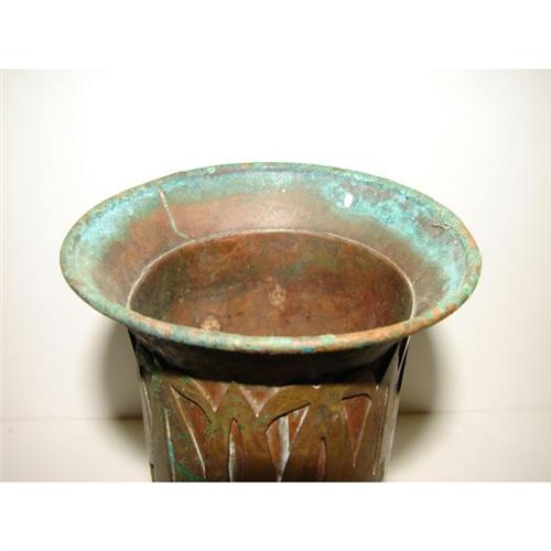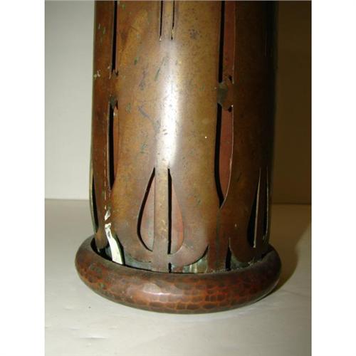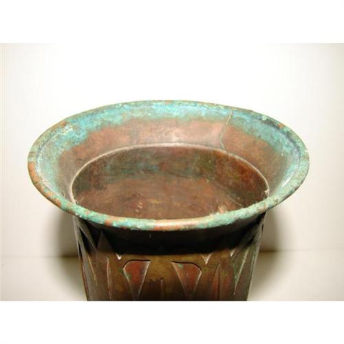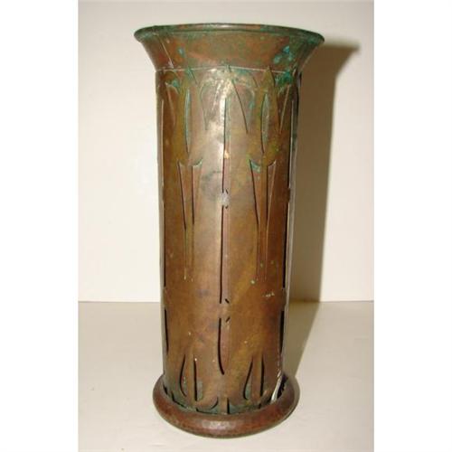 ROYCROFT HAMMERED COPPER CYLINDRICAL VASE. Has brass overlaid design around body. Shows some areas of corrosion with some areas of white paint spatter. Brass overlay shows some areas of denting. Marked on bottom. 9.375” H