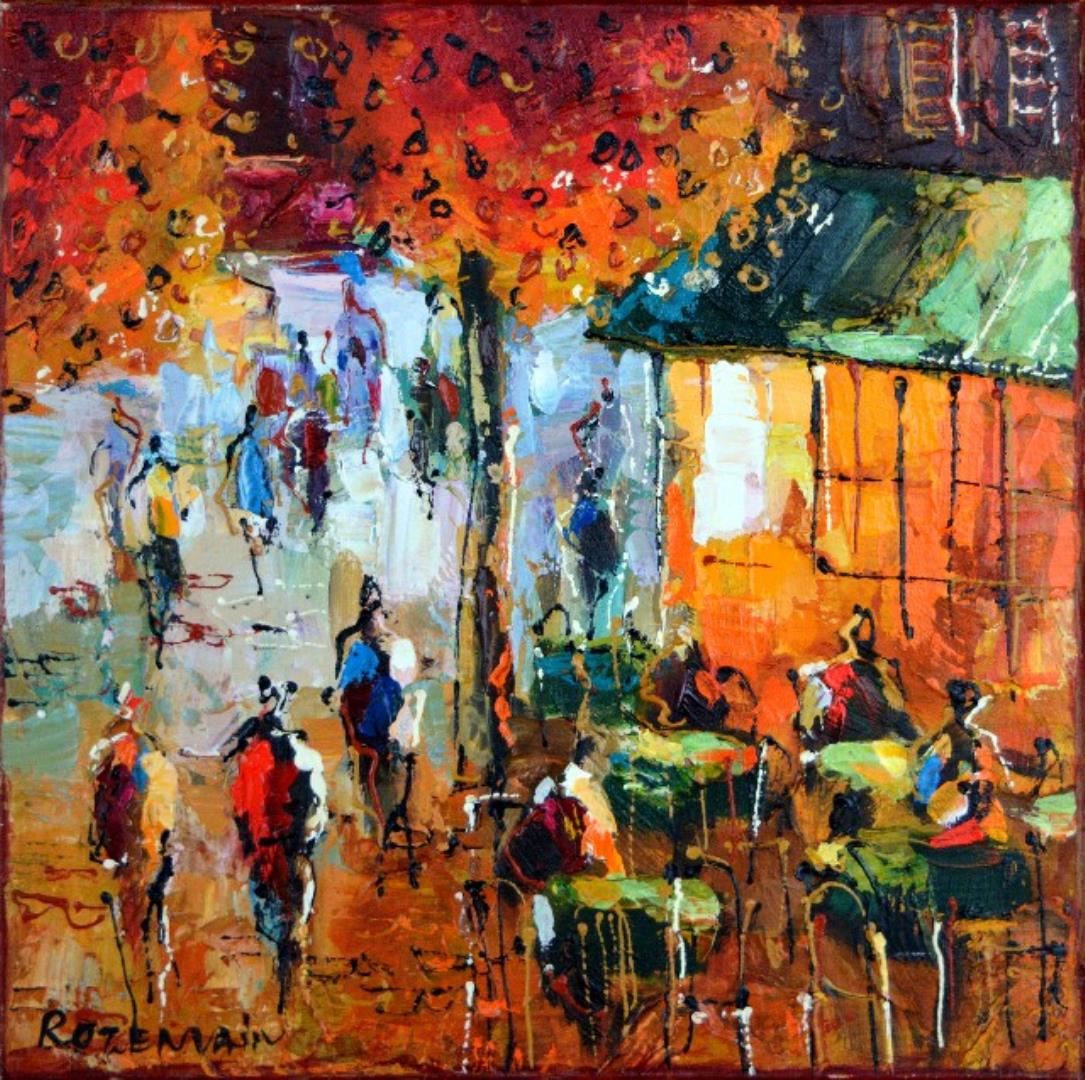 ROZENVAIN STREET PARTY SIGNED ORIGINAL. Artist: Michael Rozenvain (b. 1963) - Title: Street Party - Medium: Acrylic on Canvas - Signature: This one-of-a-kind work is hand-signed by the artist at the bottom of the image - Image Size: Approximately 16 inches x 16 inches - Framed: Stretched and Ready for Framing - Details: This work comes with a Certificate of Authenticity - Biography: Michael Rozenvain was born in Kiev in the Ukraine in 1963. He attended art school in Kiev and later on continued his studies at the Academy of Decorative Art. He immigrated to Israel in 1990 and has since had a number of one man shows as well as participating in group exhibitions. - Rozenvain's originals have sold for more than $15,000.00 - Warranty: Item GUARANTEED to be as described