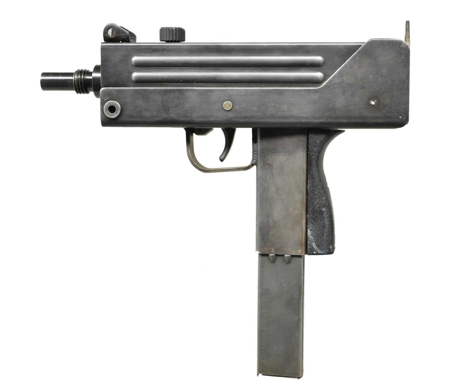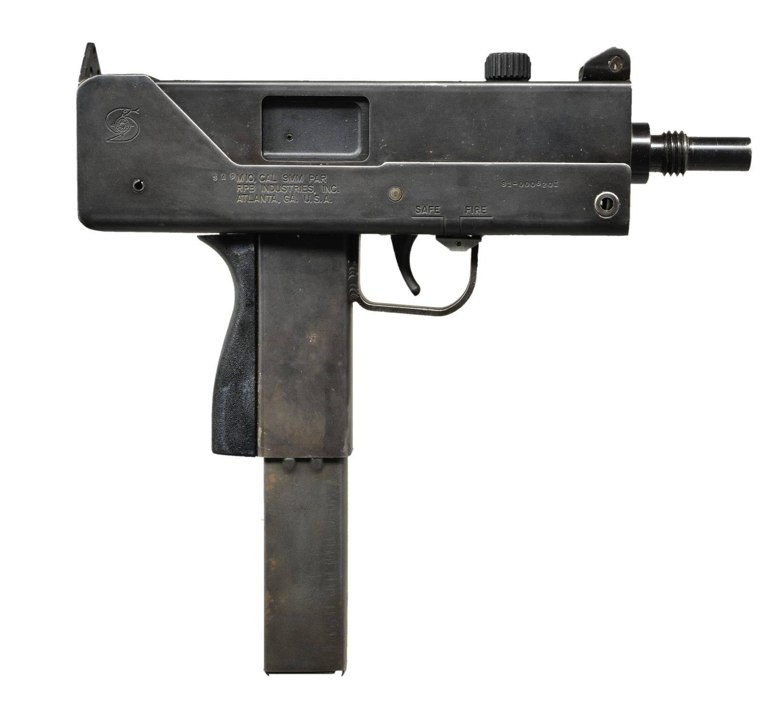 Cal. 9mm Parabellum. S# 81-0006201. Bbl. 6" threaded. Manufactured in 1981. There are very few firearms that conjure up the imagination of the general public more than the mere mention of the MAC 10. The Ingram Model 10 was originally designed in 1964. It would become the 1st of many sm. simplistic SMGs to contrast the expensive & labor intensive earlier variants such as the Thompson & Reising M50. Ingram’s 2 basic guidelines while designing the Model 10 “simple & cheap” while remaining effective & reliable. Made famous mostly by Hollywood, the M10 had appearances on the silver screen & on television eventually earning the infamous title of “The Gun That Made The 80’s Roar” starting w/ John Wayne utilizing a suppressed 9mm M10 in the 1974 movie “McQ”. A favorite example used by the organized anti-gun movement, the Mac 10 was eventually, incorrectly & inaccurately synonymous w/ every crime committed for a long period of time. The semiautomatic M10 was originally offered in semi auto as an open bolt system just like its predecessor the M10 SMG. The BATF determined that the open bolt semi autos met the criteria of a machine gun under the "readily restorable" clause & banned future manufacture, grandfathering those that were assembled and in commerce on or before June 21, 1982 under ATF ruling 82-8. Like everything else, the Federal Government tells citizens they can not have, interest in the early originals immediately skyrocketed & they have been considered highly prized collectibles for almost 40 years now. This is an awesome example of that early operating mechanism, manufactured in 1981, Uniform blued finish on both upper & lower receivers, this is a factory 9mm Parabellum variant manufactured by RPB Industries in Atlanta, GA. These pistols are very familiar to the SMG in both operation & aesthetics w/ only a few differences. Outwardly, the slots for the SMG shoulder stock are not milled in the backplate, and the selector lever on the left side is absent. Sights consist of a protected post front, and a fixed rear peep, consisting of a raised extension of the back plate. The slotted cocking knob is nestled between the sights. Safety is in the front section of the trigger guard. The self-loading operating system is blowback operated and fires from an open bolt. It utilized a fixed firing pin, integral to the bolt face. Right side of receiver is marked w/ the familiar Cobray snake & globe logo and the following stamping: "M10. CAL 9MM PAR / RPB INDUSTRIES, INC. / ATLANTA, GA. U.S.A." as well as the safety markings; "SAFE" & "FIRE" above the trigger guard. Stamped in smaller letters, before "M10" are the letters "SAP". MAGS: 2 steel 36rd & 1 steel 32rd. (3 total). UNATTACHED ACCESSORIES: black nylon Cobray carry bag, Cobray mag loader, Cobray black nylon sling, Ingram SMG operating manual & MAC "Do Everything Manual". CONDITION: finish coverage remains complete & consistent w/ a little thinning on a few high spots. Very little sign of actual use. Bore is bright & good rifling. Fire control mechanism appears to function correctly when cycled by hand. (22-4455/JZ). MODERN. $1,000-1,500.