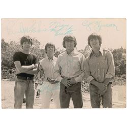 Vintage glossy 6.5 x 4.75 photo of the Beatles while filming their 1965 film Help!, signed and inscribed in blue ballpoint, "John Lennon,"...