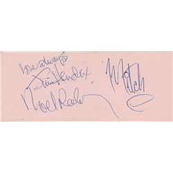 Blue ballpoint signatures, "Love always, Jimi Hendrix," "Mitch," and "Noel Redding," on an off-white 7.25 x 3 sheet. I...