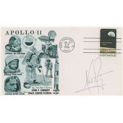 Appealing launch date postal cover with a cachet honoring the crew of Apollo 11, postmarked July 16, 1969, signed in black ballpoint by Armstrong. In