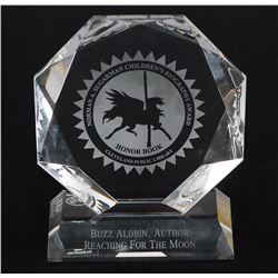 Two awards presented to Buzz Aldrin: a fine crystal trophy for the "Norman A. Sugarman Children's Biography Award" presented to Aldrin...
