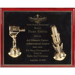 Buzz Aldrin's Art Gilmore Career Achievement Award plaque, 13 x 10.5, featuring three-dimensional camera and microphone statuettes attached to t...