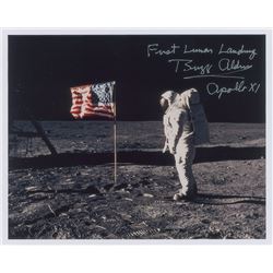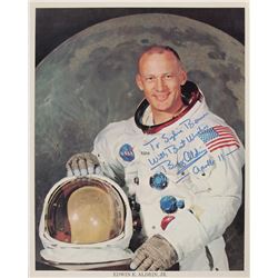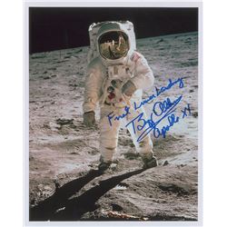 Color satin-finish 8 x 10 full-length photo of Aldrin on the lunar surface, with a reflection of Armstrong in his visor, signed in blue felt tip, “Fir