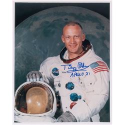 Color semi-glossy 8 x 10 photo of Aldrin posing in his white space suit against a lunar backdrop, signed in blue felt tip, “Buzz Aldrin, Apollo XI.” I