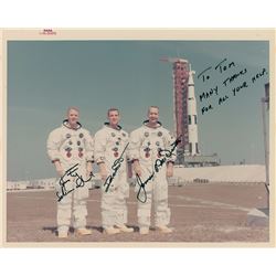 Official color glossy 10 x 8 NASA red-numbered photo of the Apollo 9 crew posing in their white space suits with the Saturn rocket resting in its towe