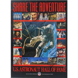 Limited edition color 18 x 24 poster for the US Astronaut Hall of Fame entitled 'Share the Adventure,' signed in black felt tip by sixteen a...