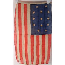 Hand-stitched wool bunting flag with thirteen stars and thirteen stripes, made circa 1850–1870, measuring 49 x 30.25 overall with a 23 x 17.25 canton.