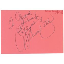 Ink signature, “To Edward, Love! Jayne Mansfield,” on a pink 5 x 3.5 slip. Typed collector’s notation to upper right corner dates the signature to Jun