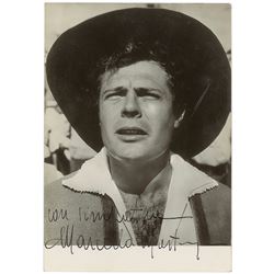 Glossy 4 x 5.75 postcard photo of Mastroianni, signed in black ink. In fine condition, with trivial creases and surface impressions.