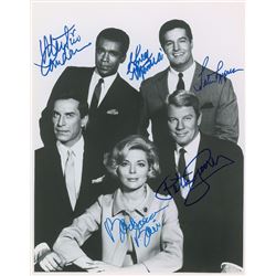 Glossy 11 x 14 photo of the cast from Mission: Impossible, signed in blue felt tip by Martin Landau, Greg Morris, Peter Lupus, Peter Graves, and Barba