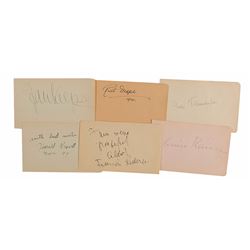 Ink signatures of twelve performing artists on opposite sides of six album pages, including: Gloria Swanson, Henri Temianka, Ruth Draper, Rise Stevens