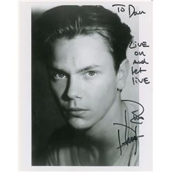 Uncommon glossy 8 x 10 photo of the young actor, signed and inscribed in black felt tip, “To Dan, Live on and let live, River Phoenix.” In fine condit