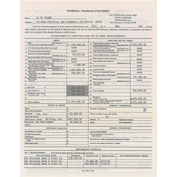 DS, signed “R. M. Nixon,” one page both sides, 8.5 x 11, May 31, 1978. Personal financial statem