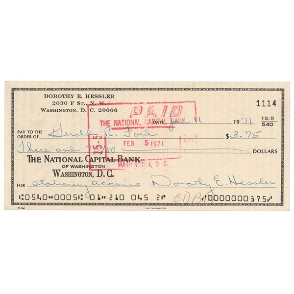 Personal check, 6 x 2.75, filled out and signed by Dorothy E. Hessler, payable to Gerald R. Ford for $3.75, January 11, 1971, endorsed on the reverse