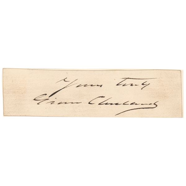 Bold ink signature, "Yours truly, Grover Cleveland,” on an off-white 4 x 1 slip. In fine condition, with lightly trimmed ed