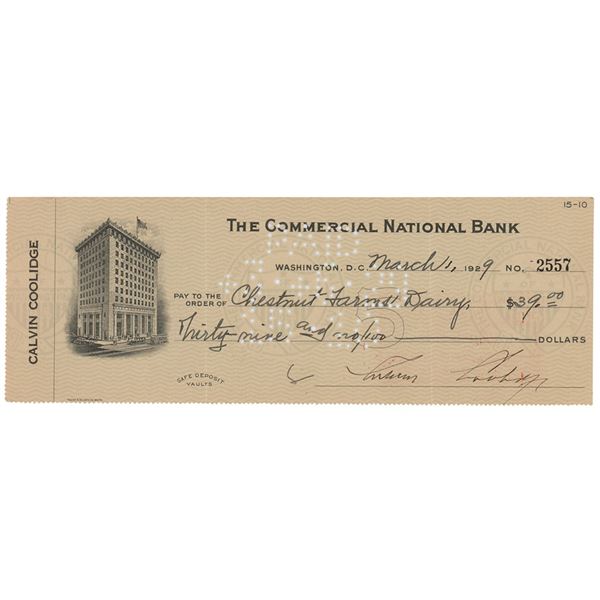 Personal check, 8.5 x 3, filled out in another hand and signed by Coolidge as president, "Calvin Coolidge," payable to Chestnut Farms Dair...