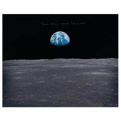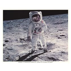 Official color 10 x 8 NASA lithograph of Aldrin descending the LM ladder during the Apollo 11 mission, signed and inscribed in black felt tip, "...