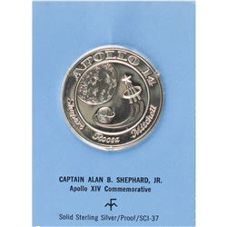 Solid sterling silver commemorative medal proof produced by the Franklin Mint to honor the historic flight of Apollo 14, 40 mm in diameter, featuring