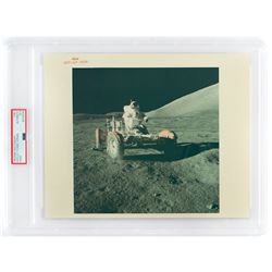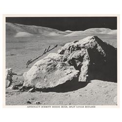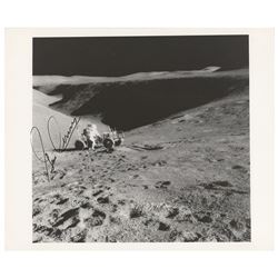 Official glossy 10 x 8.25 NASA photo of Gene Cernan tending to the lunar rover during the Apollo 17 mission, signed in black felt tip. In fine conditi