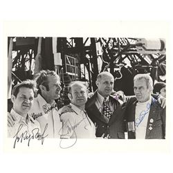 Official glossy 10.25 x 8 NASA photo of the American and Soviet crews of the historic and Space Race-ending Apollo-Soyuz mission, signed in various in