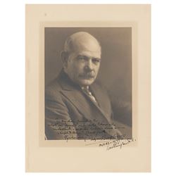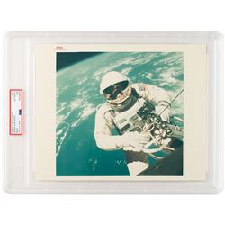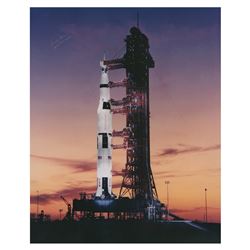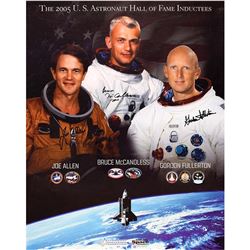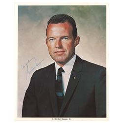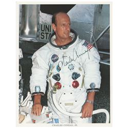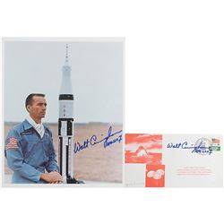 Official color 10 x 8 NASA lithograph of Shepard in his white space suit in front of the Apollo 14 insignia, signed and inscribed in black felt tip,...