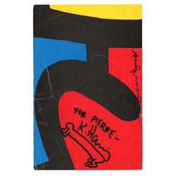 Original ink sketch of a waterfront scene above the text of a dinner menu accomplished by Picabia on an off-white 3.75 x 6 card, signed with his initi