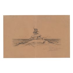 Original ink sketch by Palmer of one of his famous Brownie characters on an off-white 4 x 2 slip, signed in ink, "Palmer Cox, Brownieland, 1913...