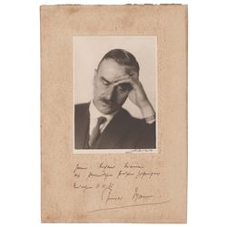Vintage matte-finish 3.25 x 4.5 portrait of Mann in a thoughtful pose, affixed to a 5.5 x 8.25 mount, signed and inscribed on the mount in fountain pe