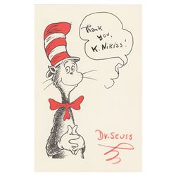 Color 5.5 x 8.5 print of the Cat in the Hat, inscribed in black ink inside a hand-drawn speech bubble, "Thank you, K. Nikias!," and signed...