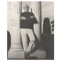 Oversized matte-finish 10.75 x 13.5 full-length photo of Updike posing in front of two large pillars, signed in black felt tip, "John Updike an...