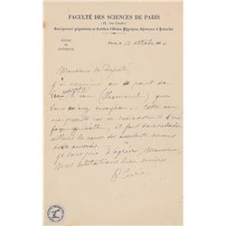 Sought-after ALS in French, signed “P. Curie,” one page, 5.25 x 8.25, Faculte des Sciences de Paris letterhead, October 12, 1904. Letter to a deputy,