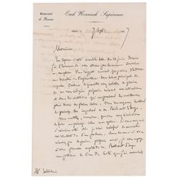 ALS in French, signed "L. Pasteur," one page both sides, 5.25 x 8, Ecole Normale Supérieure letterhead, September 7, 1867. Letter to ...