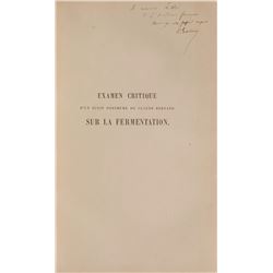 Signed book: Examen Critique d'un ecrit posthume de Claude Bernard sur la Fermentation. Paris: Gauthier-Villars, 1879. Leatherbound hardcover in...