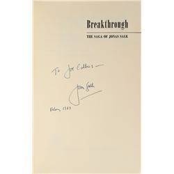Signed book: Breakthrough: The Saga of Jonas Salk. Second printing. NY: Trident Press, 1966. Hardcover with dust jacket, 6 x 8.5, 435 pages. Signed an
