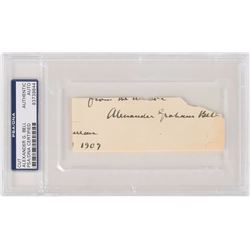Bold ink signature, "Alexander Graham Bell,” on an off-white 4.5 x 1.5 slip clipped from the close of a letter, with Bell adding the year, &quo...