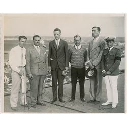 Superb vintage semi-glossy 10 x 8 full-length photo of Lindbergh posing with flying aces Marcel Doret, Cliff Henderson, Fritz Lohse, Richard Atcherley