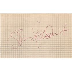 Red ballpoint signature, "Jimi Hendrix,” on an off-white 5.75 x 3.5 gridded sheet. In fine condition. Accompanied by a full letter of authentic...
