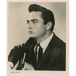 Vintage glossy 7.75 x 9.5 publicity photo of Cash wearing a dark suit and holding a guitar, signed and inscribed in black ballpoint, "To Evelyn...